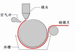 ....鑄片是指熔融塑料在壓力的推動下,通過長形的口膜,在外力(氣流)作用下,使熔融塑料迅速貼附在激冷輥表面上制成固態(tài)片材的過程。如圖2所示: