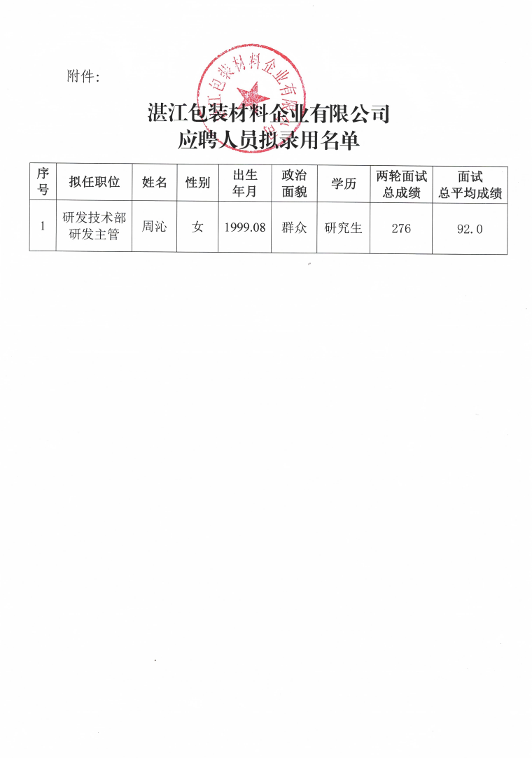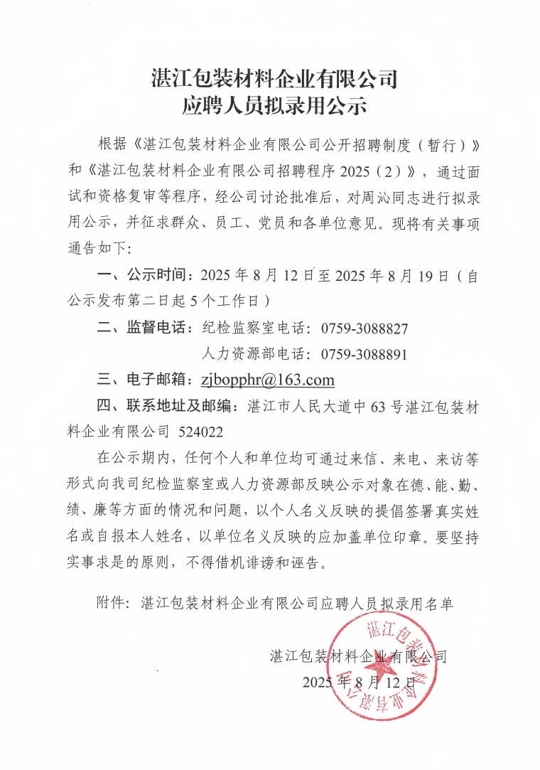 湛江包裝材料企業(yè)有限公司應聘人員擬錄用公示