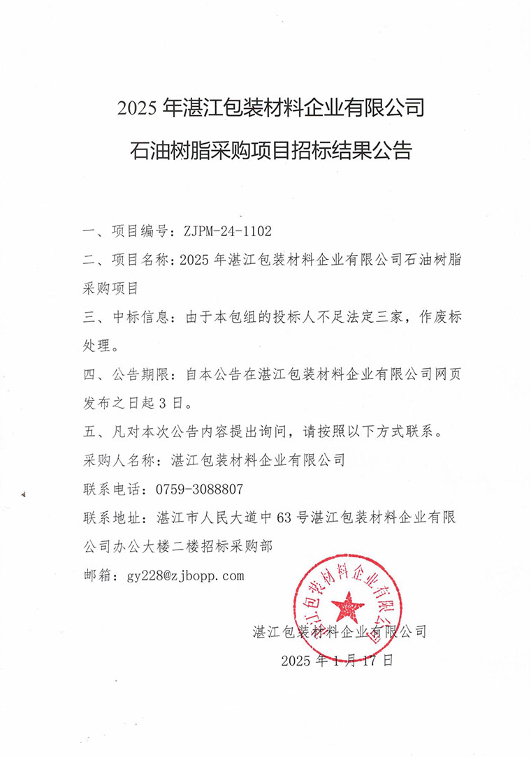 2025年湛江包裝材料企業(yè)有限公司石油樹脂采購項(xiàng)目招標(biāo)結(jié)果公告