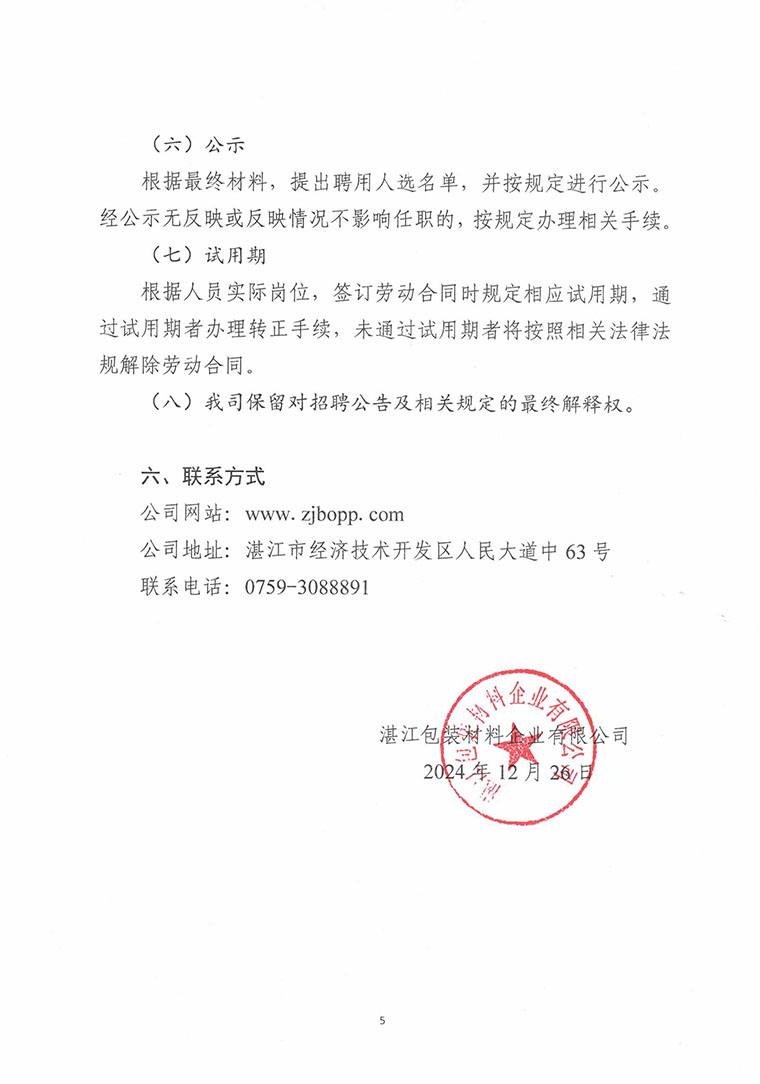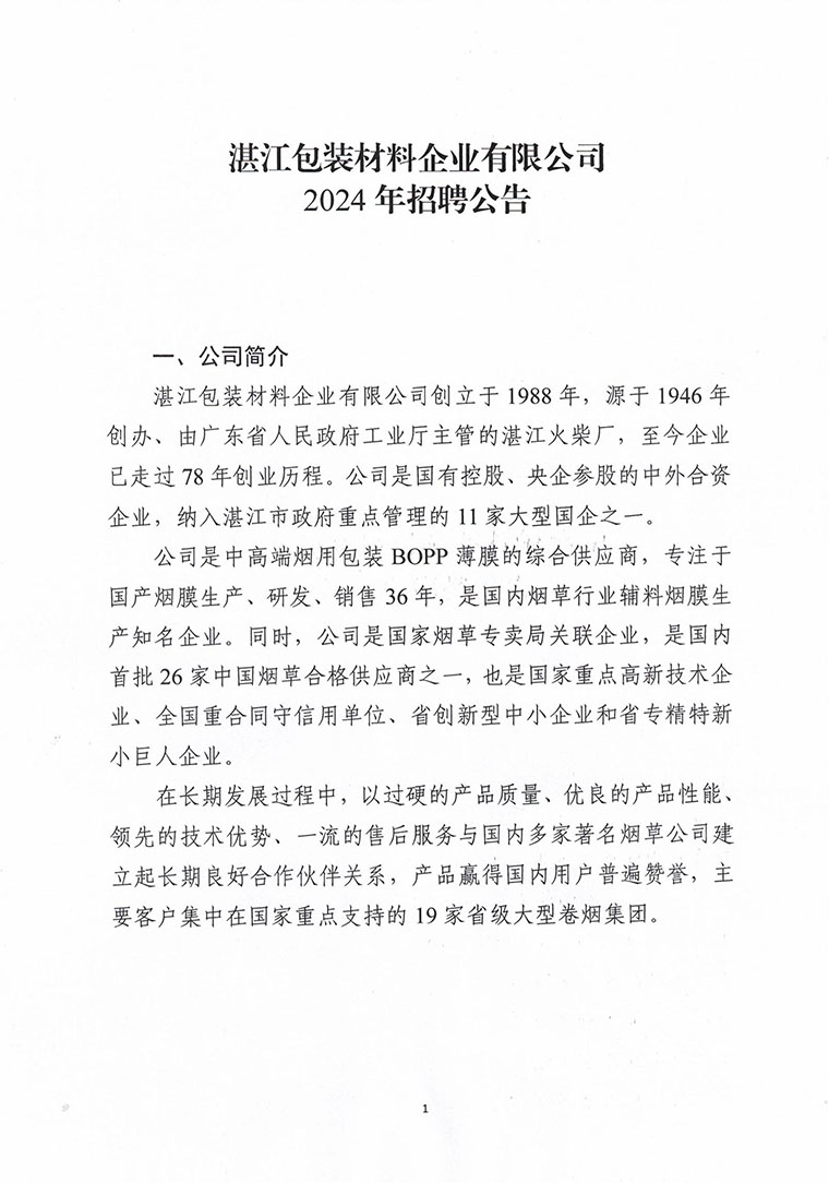 湛江包裝材料企業(yè)有限公司2024年招聘公告(二)