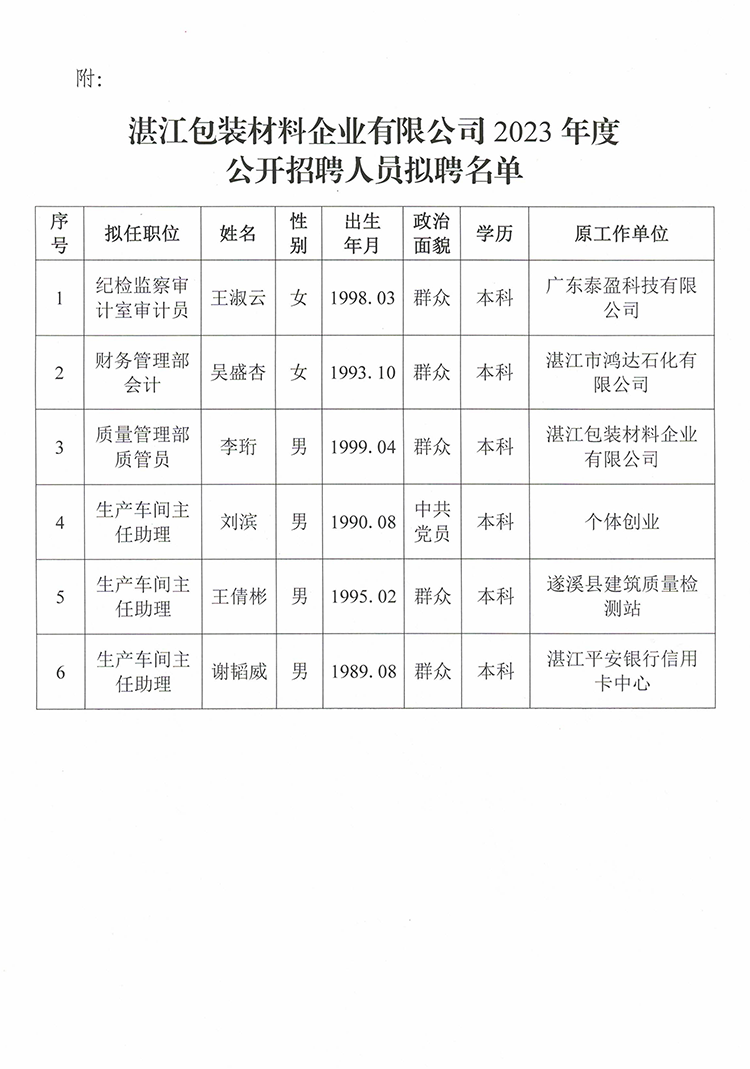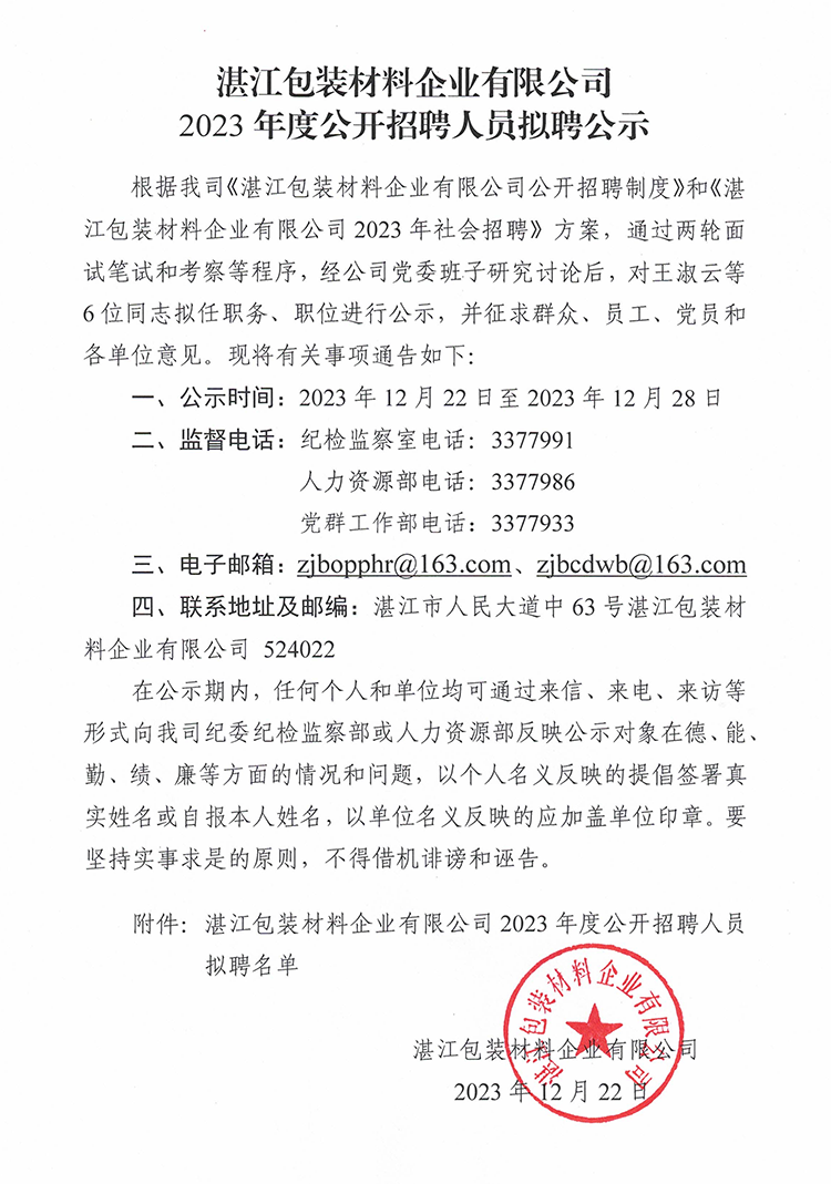 湛江包裝材料企業(yè)有限公司2023年度公開招聘人員擬聘公示