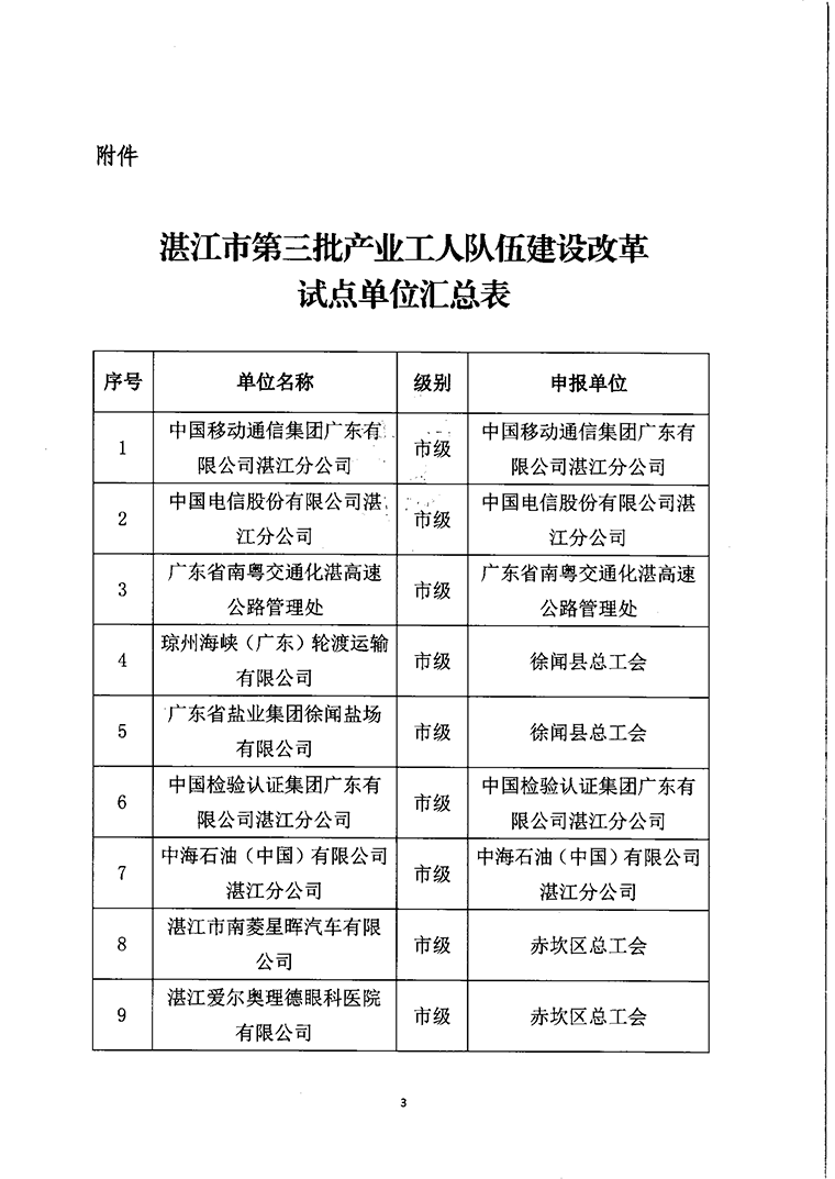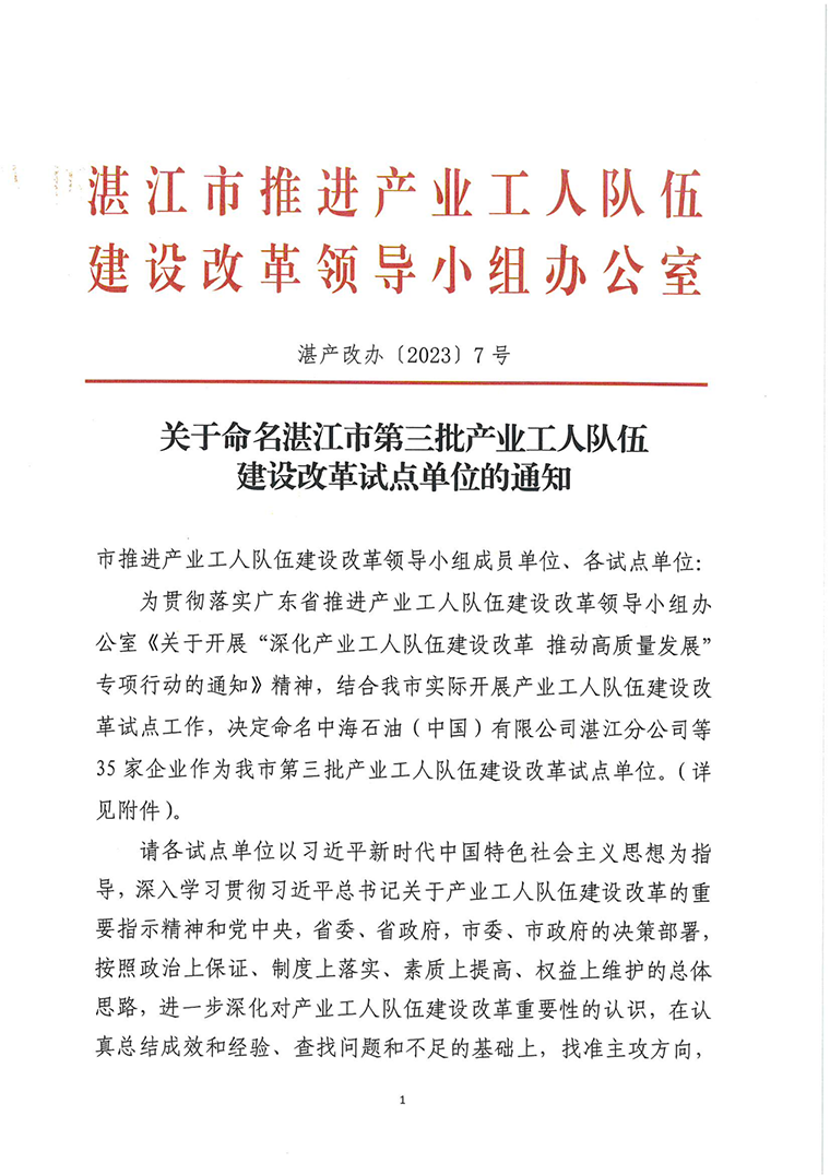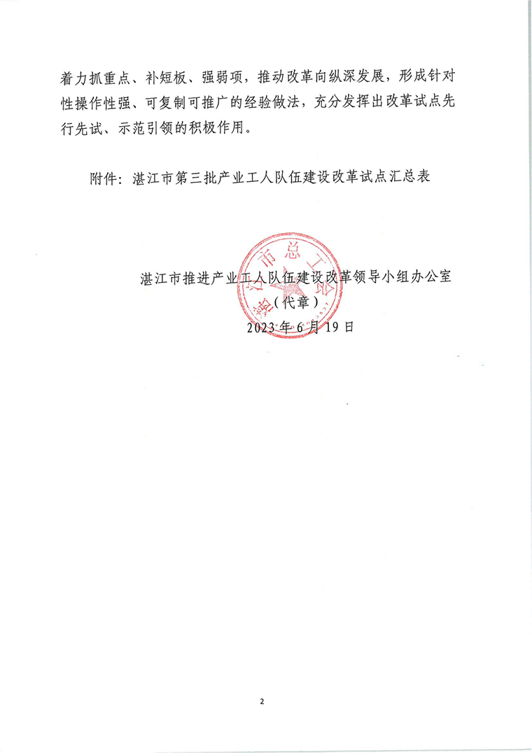 近日,經(jīng)湛江市推進產(chǎn)業(yè)工人隊伍建設改革領導小組辦公室審批,市推進產(chǎn)業(yè)工人隊伍建設改革領導小組辦公室下發(fā)湛產(chǎn)改辦〔2023〕7號《關于開展命名湛江市第三批產(chǎn)業(yè)工人隊伍建設改革試點單位的通知》,我司被評為“第三批產(chǎn)業(yè)工人建設改革試點單位”。