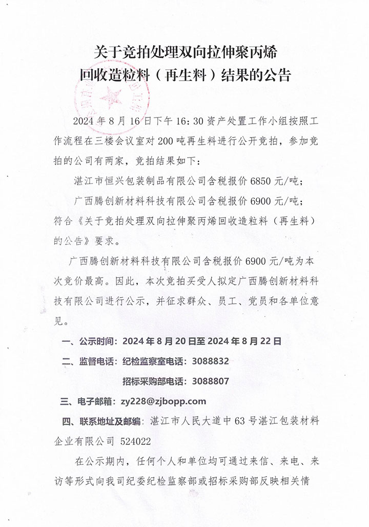 關(guān)于競(jìng)拍處理雙向拉伸聚丙烯 回收造粒料(再生料)結(jié)果的公告