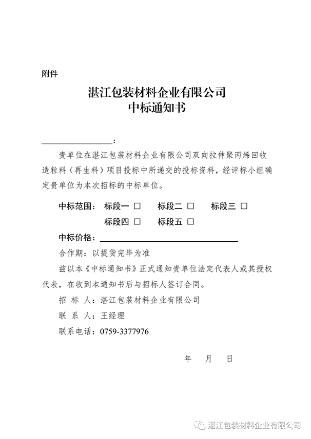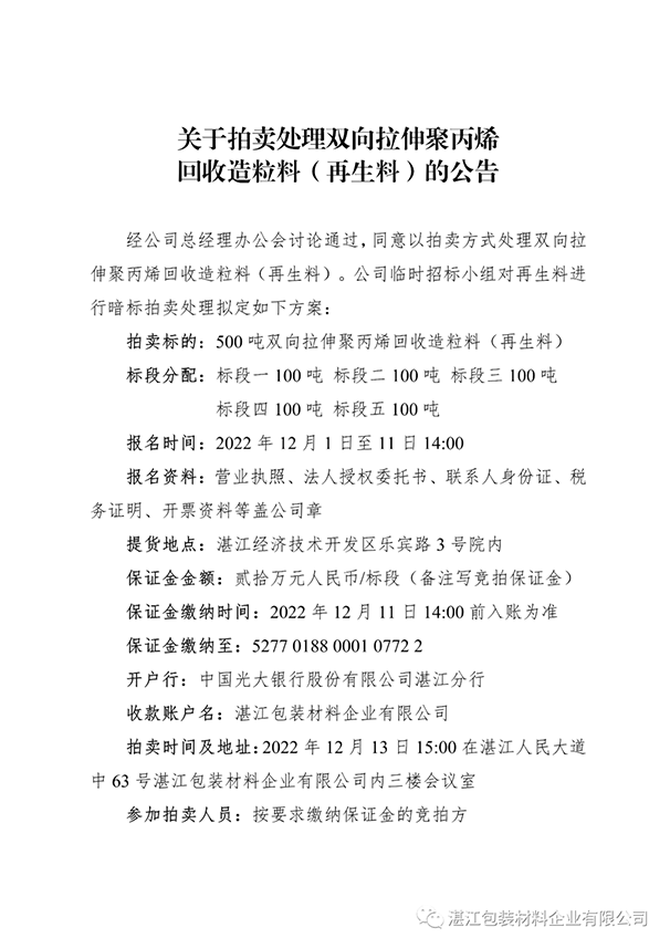 關(guān)于拍賣處理雙向拉伸聚丙烯回收造粒料(再生料)的公告