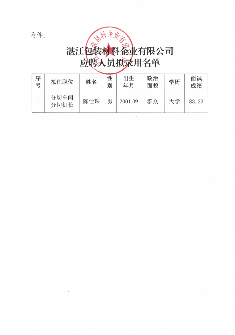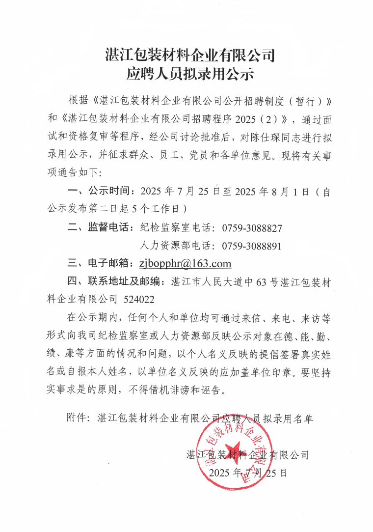 湛江包裝材料企業(yè)有限公司應聘人員擬錄用公示