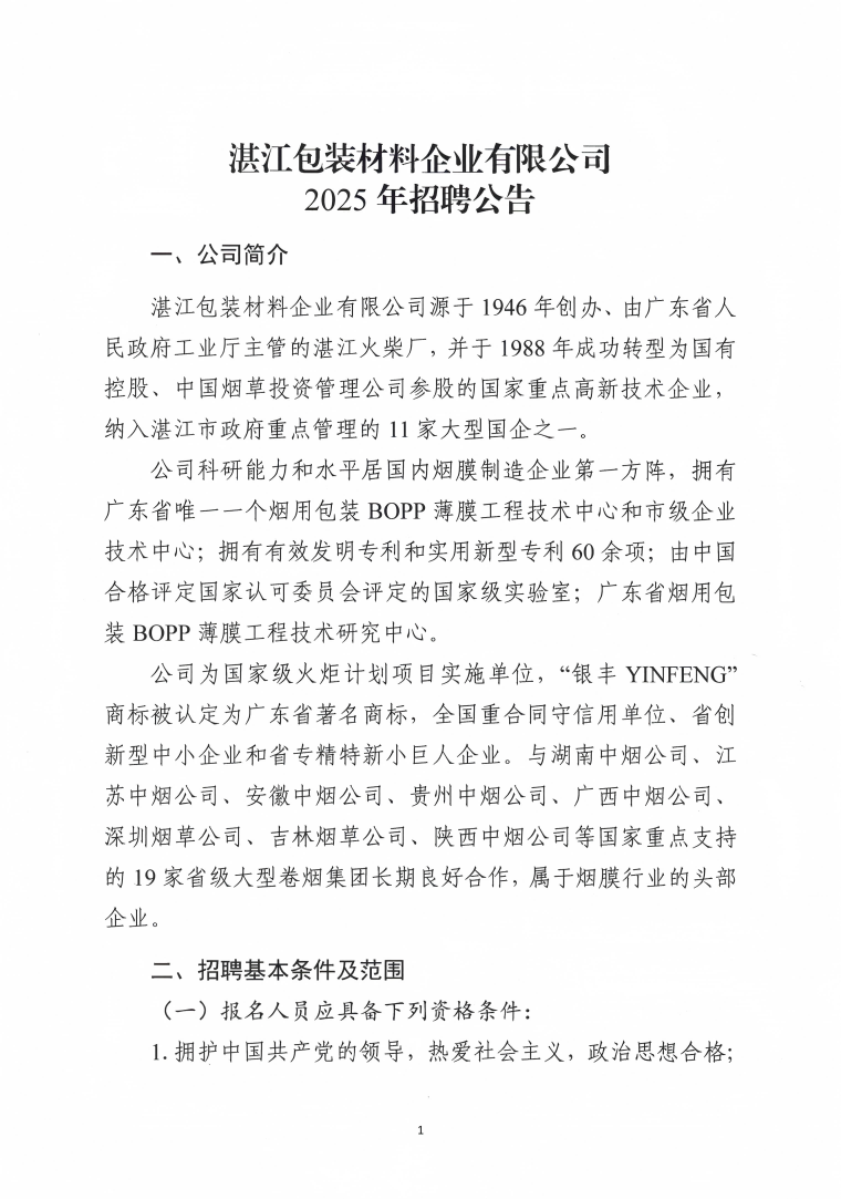 湛江包裝材料企業(yè)有限公司2025年招聘公告