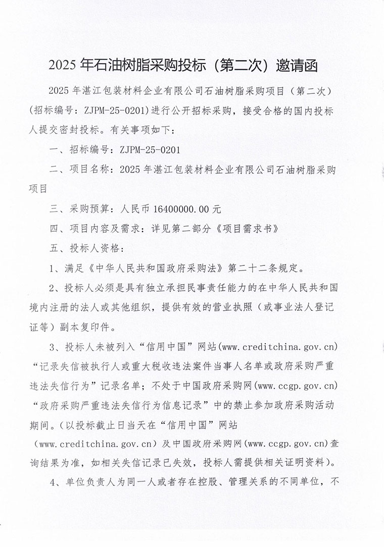 2025年石油樹(shù)脂采購(gòu)?fù)稑?biāo)(第二次)邀請(qǐng)函