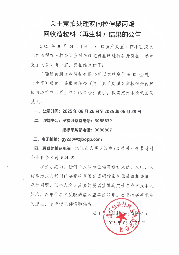 關(guān)于競拍處理雙向拉伸聚丙烯回收造粒料(再生料)結(jié)果的公告