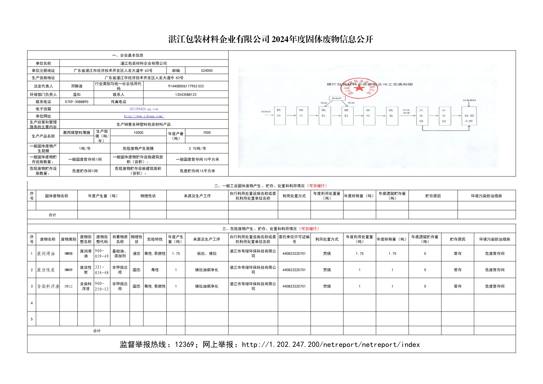 湛江包裝材料企業(yè)有限公司2024年度固體廢物信息公開